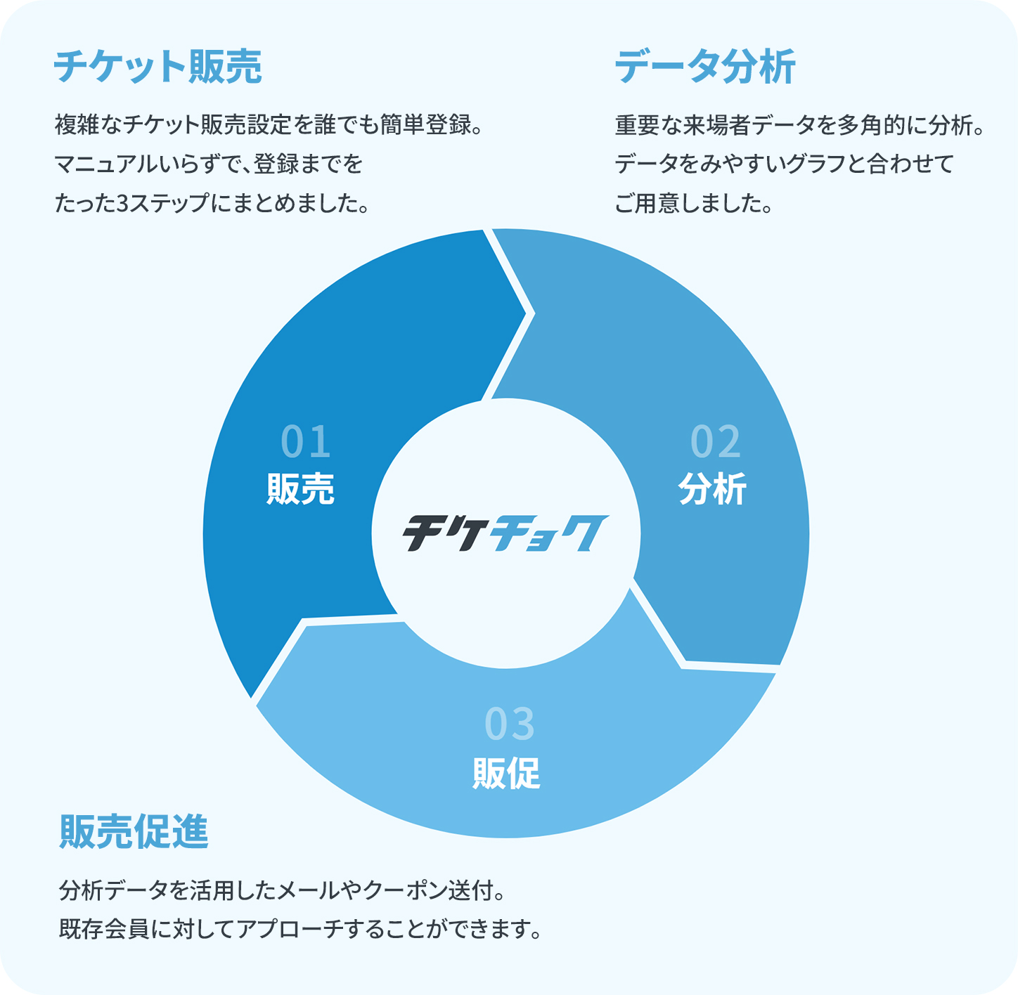 チケットの販売から分析、販促まで一気通貫で管理できるチケット直販システムです。煩雑になりがちなチケット販売業務をシンプルかつ豊富な機能でサポートします。