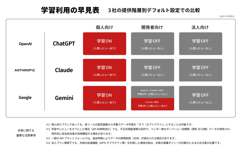 ①で触れた通り、学習利用はデータ保持や人間レビューの範囲にも影響する、5つの観点の中で最も根本的な項目となります。まず、この学習利用が3社の提供階層別でどう異なるかを早見表にまとめました。