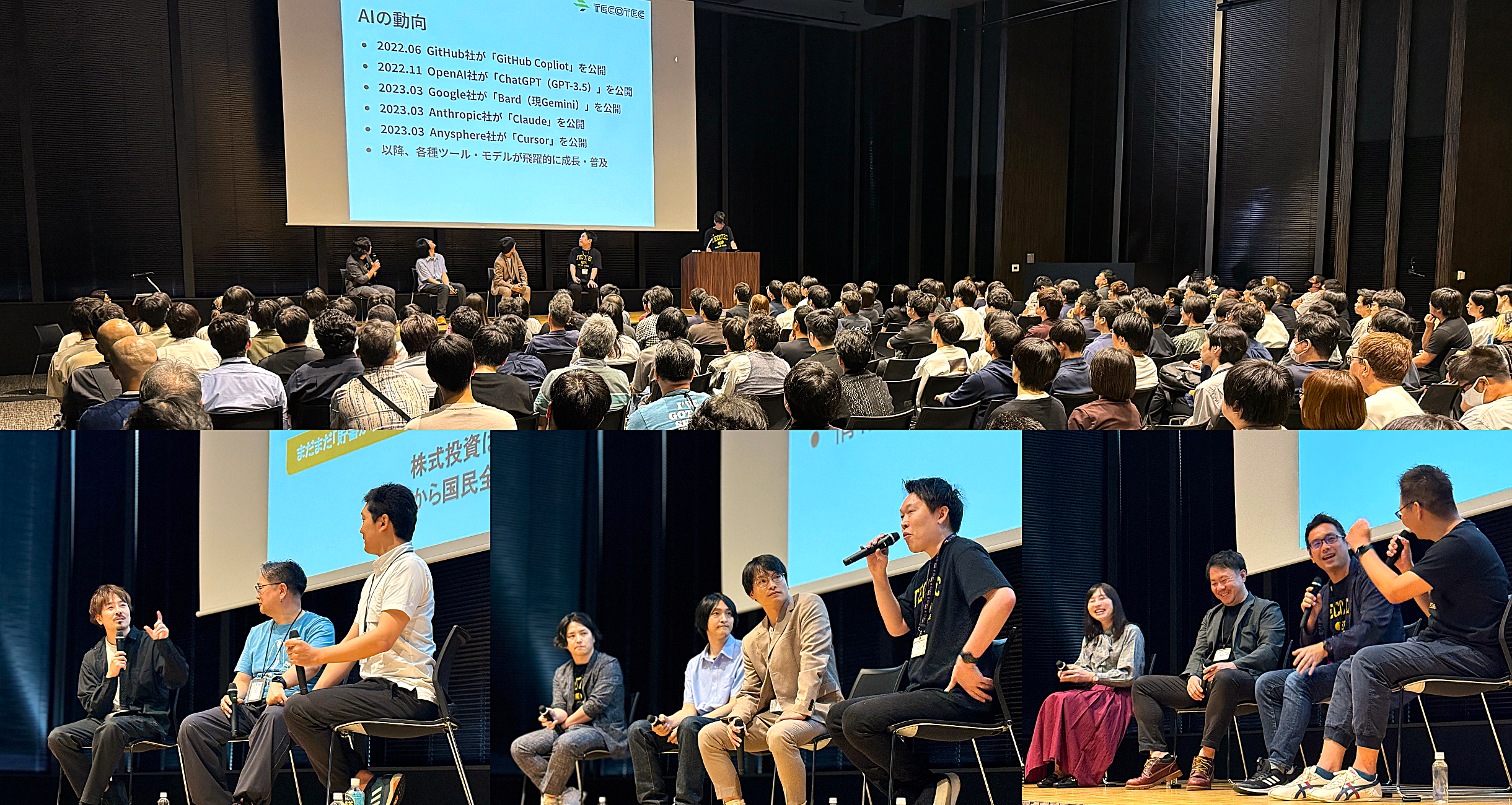 取締役CTOをモデレーターに迎え、AI技術の導入や活用に伴う課題と可能性についてディスカッションが行われました。AIの動向を振り返りつつ、具体的なプロジェクトの事例も交えながら、議論が行われました。エンジニアリングだけではなく、マネジメント面での活用などもパネラーの実体験を基に話され、全社員がAI時代の変化にどう向き合うかを考える貴重な機会となりました。